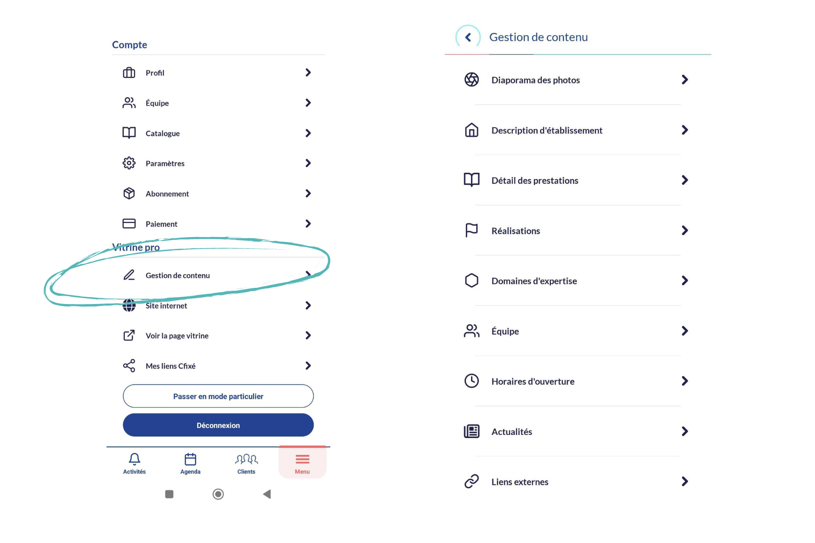 Gardez donc en tête que pour tout ce qui est contenu : photos et textes descriptifs, il faut se rendre dans la rubrique "Contenu" ou "Gestion de contenu" sur l'application mobile