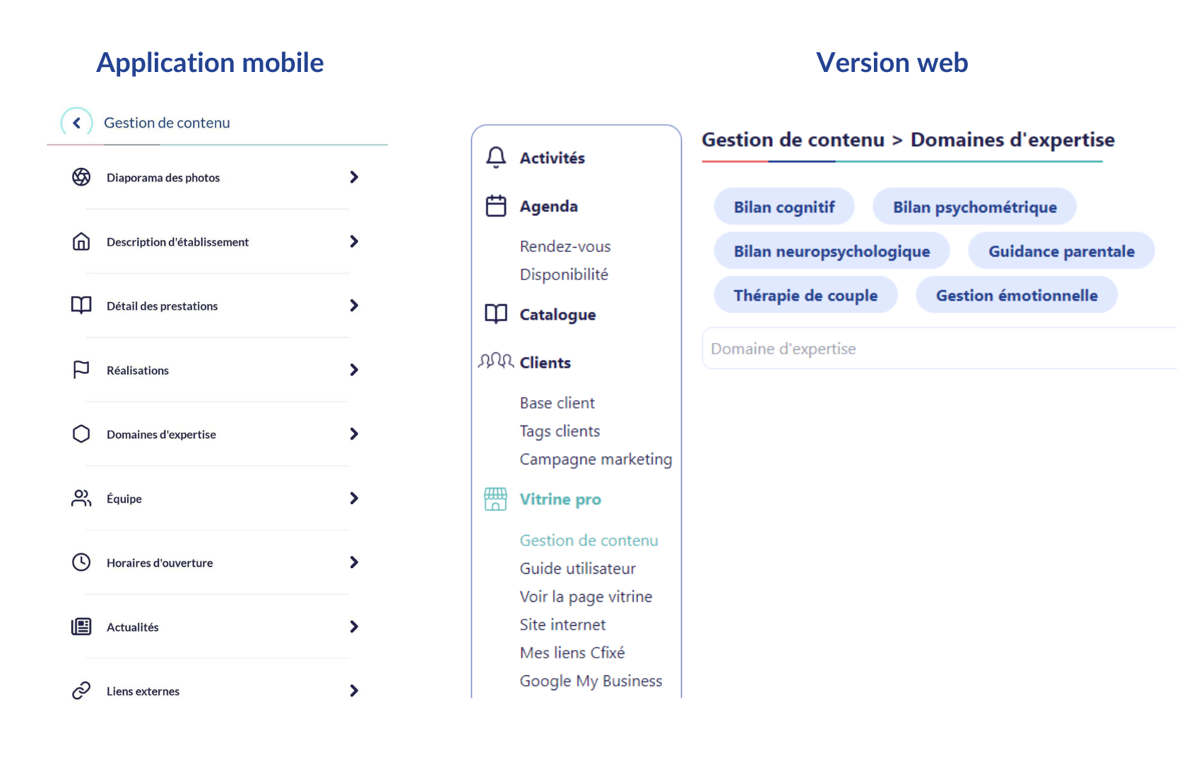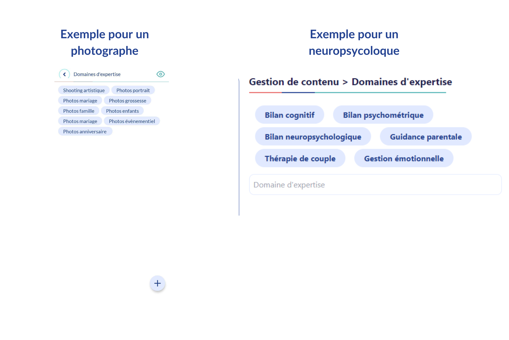 La section domaines d'expertise permet d'identifier les mots clés qui permettent de définir l'expertise de chaque professionnel : ses specialistés et domaines d'intervention.