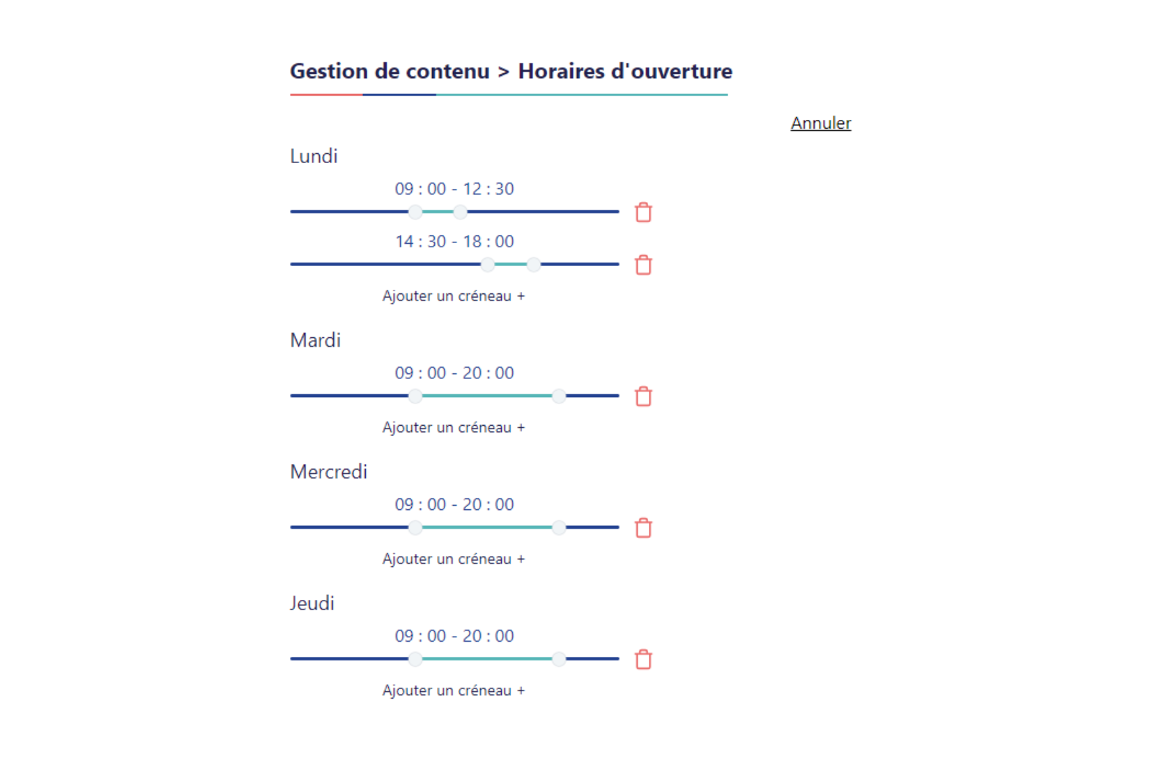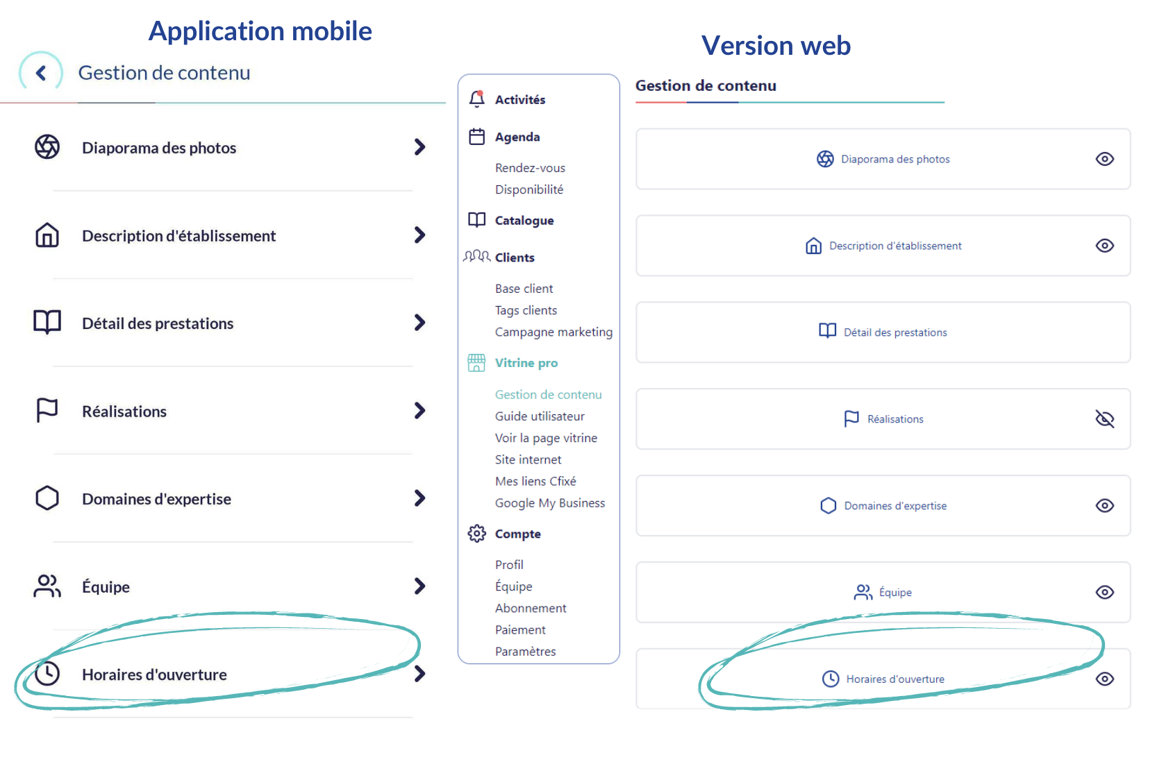 Se rendre dans Gestion de contenu > Horaires d'ouverture depuis l'application mobile Cfixé ou depuis la verison web pour ordinateur via ce lien : https://cfixe.com/my-account/pro/cms/schedule