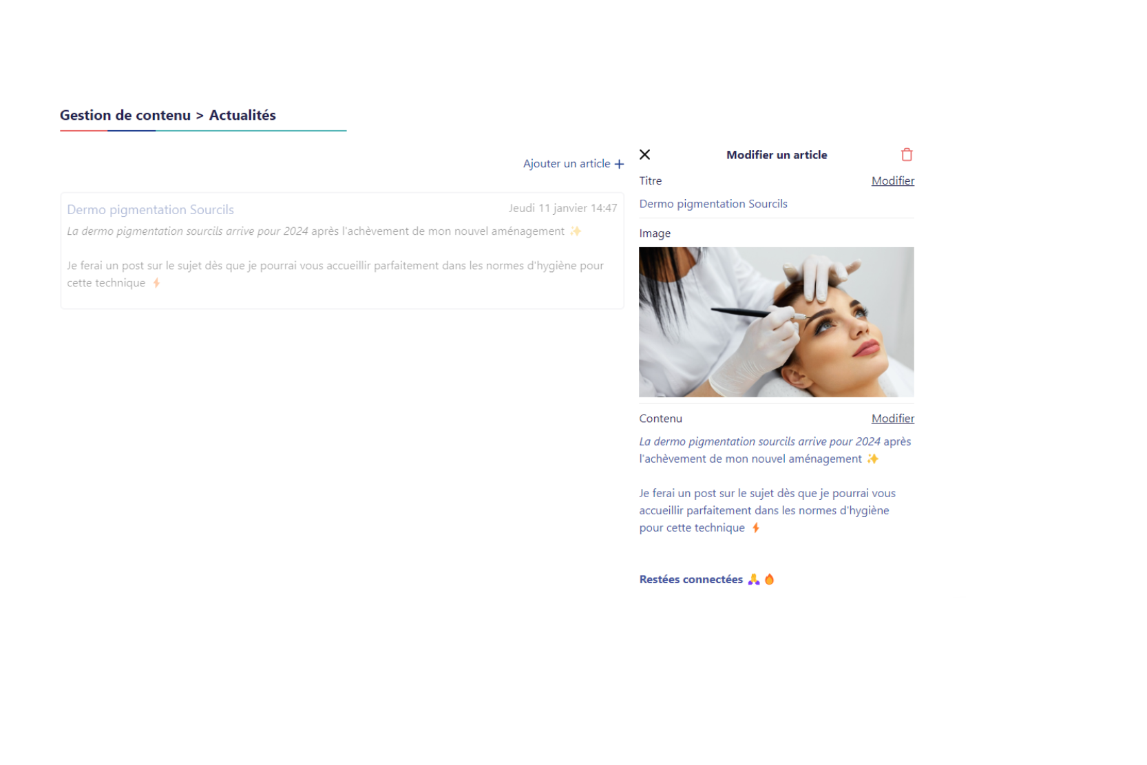 Se rendre dans gestion de Gestion de contenu ensuite dans la rubrique actualités directement depuis votre application mobile Cfixé ou depuis votre espace professionnel sur ordinateur ou en utilisant ce lien :