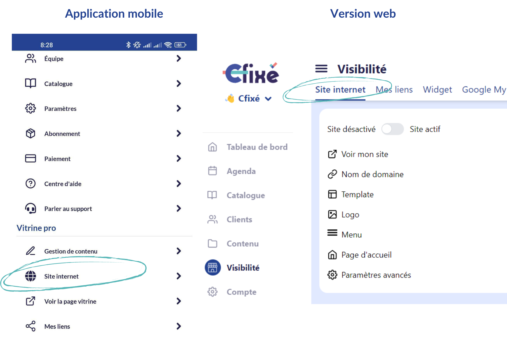 Où Trouver : Sur l'application, allez à l'onglet 'Site internet'. Sur la version web, sélectionnez la section 'Visibilité' puis l'onglet 'Site internet' ou via ce lien direct : https://cfixe.com/my-account/pro/website/settings