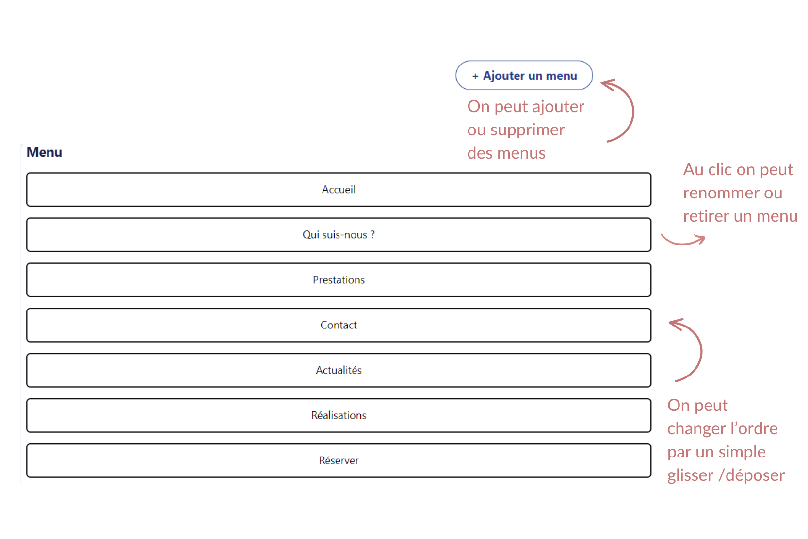 L'organisation du contenu sur votre site internet Cfixé est cruciale pour refléter votre professionnalisme et faciliter l'interaction des visiteurs avec votre marque. Voici pourquoi et comment personnaliser l'ordre des éléments dans votre menu :