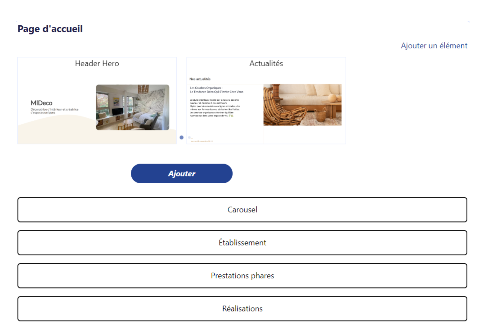 Contenu en Vedette : Sélectionnez les éléments que vous souhaitez mettre en avant sur votre page d'accueil. Ceci pourrait inclure des services populaires, des offres spéciales ou des nouveautés. Vous pouvez gérer l'ordre d'apparaition par un simple geste de glisser/déposer (drag and drop).