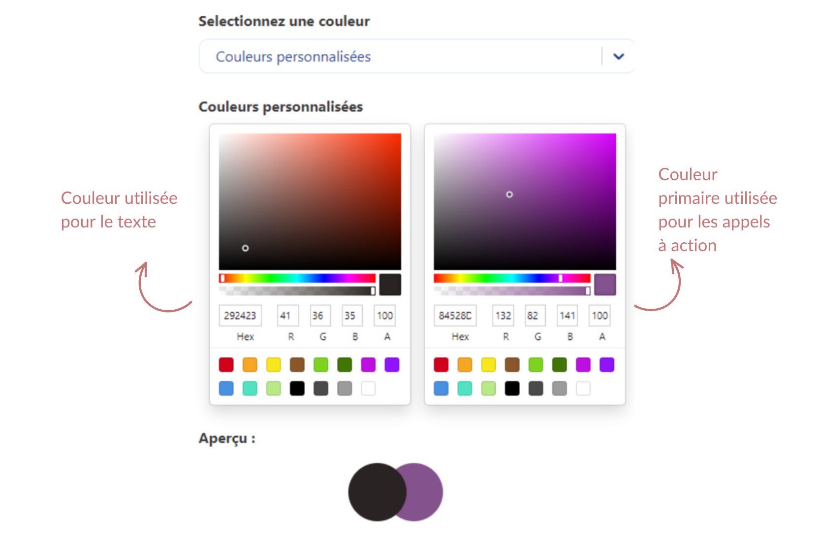 Palette de Couleurs : Pour le texte, privilégiez une couleur sombre pour une lecture facile. Pour la couleur principale, choisissez celle qui correspond à votre marque ou logo.