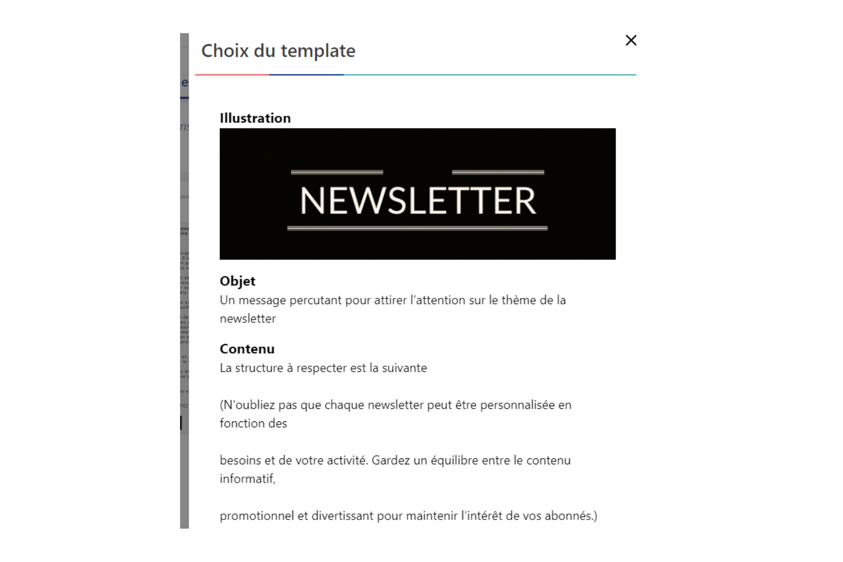 Pour gérer vos newsletters le fonctionnement est identique, vous avez un template qui vous indique la démarche à suivre tout à la fin, vous a juste à comléter avec votre propore contenu et à suivre les indications.